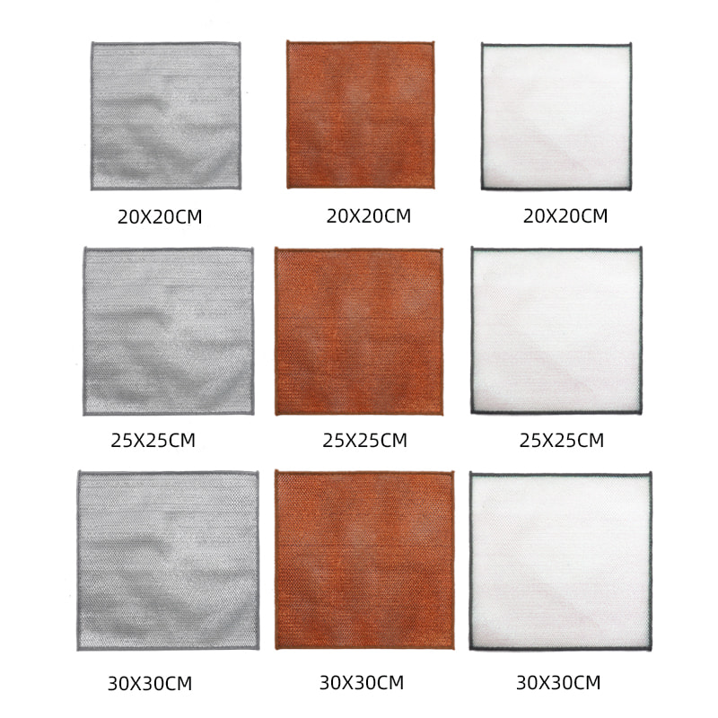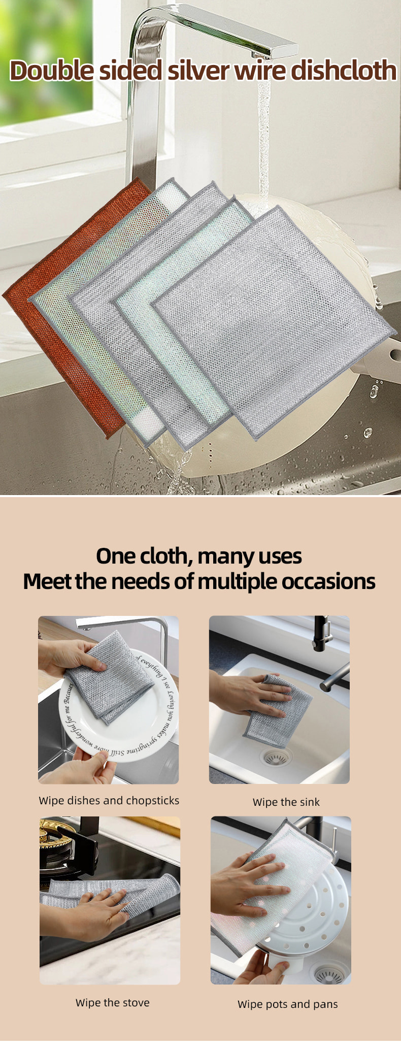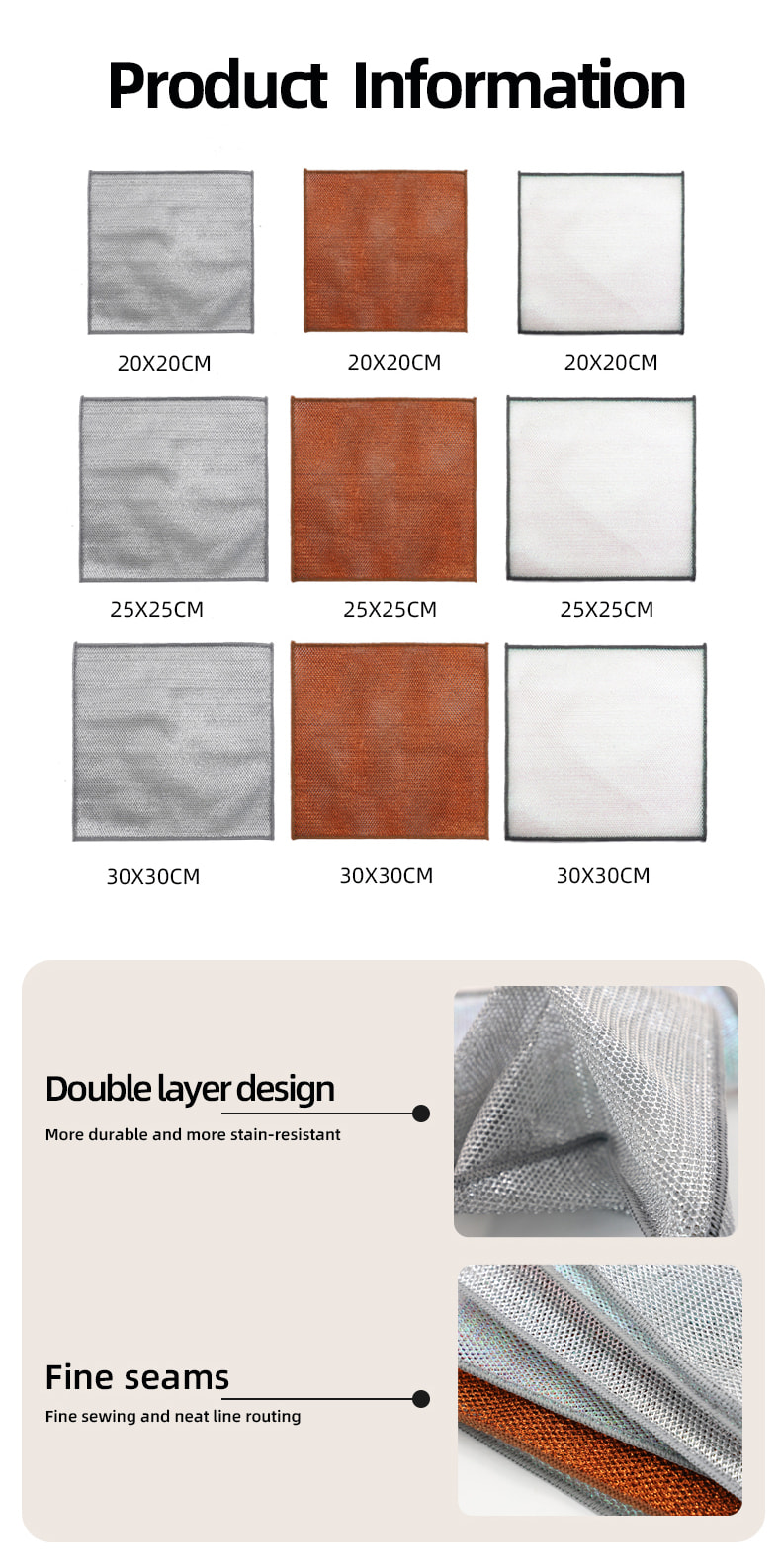 پارچه ظرفی سیم نقره ای دو طرفه، ساخته شده از ابریشم برنز، بسیار گران است. بدون پوشش، بدون پودر، بدون محو شدن؛ بدون روغن، بدون روغن، خراش دادن قوی اما بدون آسیب به ظروف پخت و پز. ساخته شده از ابریشم رنگارنگ، روغنی و نچسب است و ارزش ظاهری بالایی دارد. بدون پوشش، بدون افت پودر، بدون محو شدن رنگ. خراش دادن قوی اما بدون آسیب به ظروف پخت و پز.