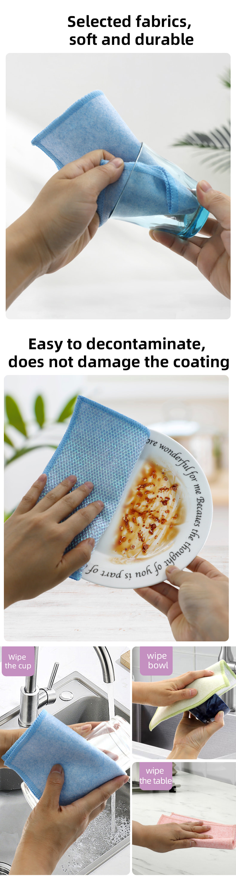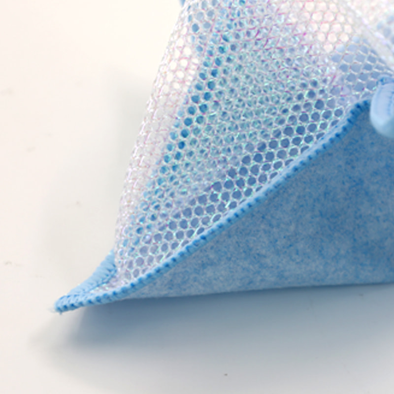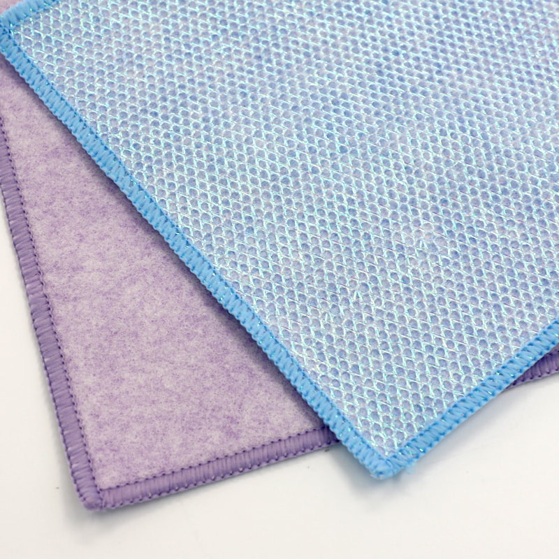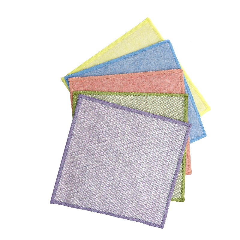 ساختار خاص شکل، رنگارنگ، ظاهر بالا؛ یک طرف پارچه تمیز کننده رنگارنگ با قابلیت خراش دادن قوی است و طرف دیگر پارچه مشبک است که عملکرد دوگانه تمیز کردن را در حین خراش دادن انجام می دهد. فاقد روغن بوده و قابلیت جذب آب قوی دارد. یک طرف آن با ابریشم رنگارنگ با طرح های مختلف کاشته شده است و روی دیگر آن سطح پارچه ویسکوزی غیر روغنی و جاذب آب است که زیبایی دارد و می تواند عملکرد دوگانه شستشو و شستشو را از یک طرف انجام دهد.